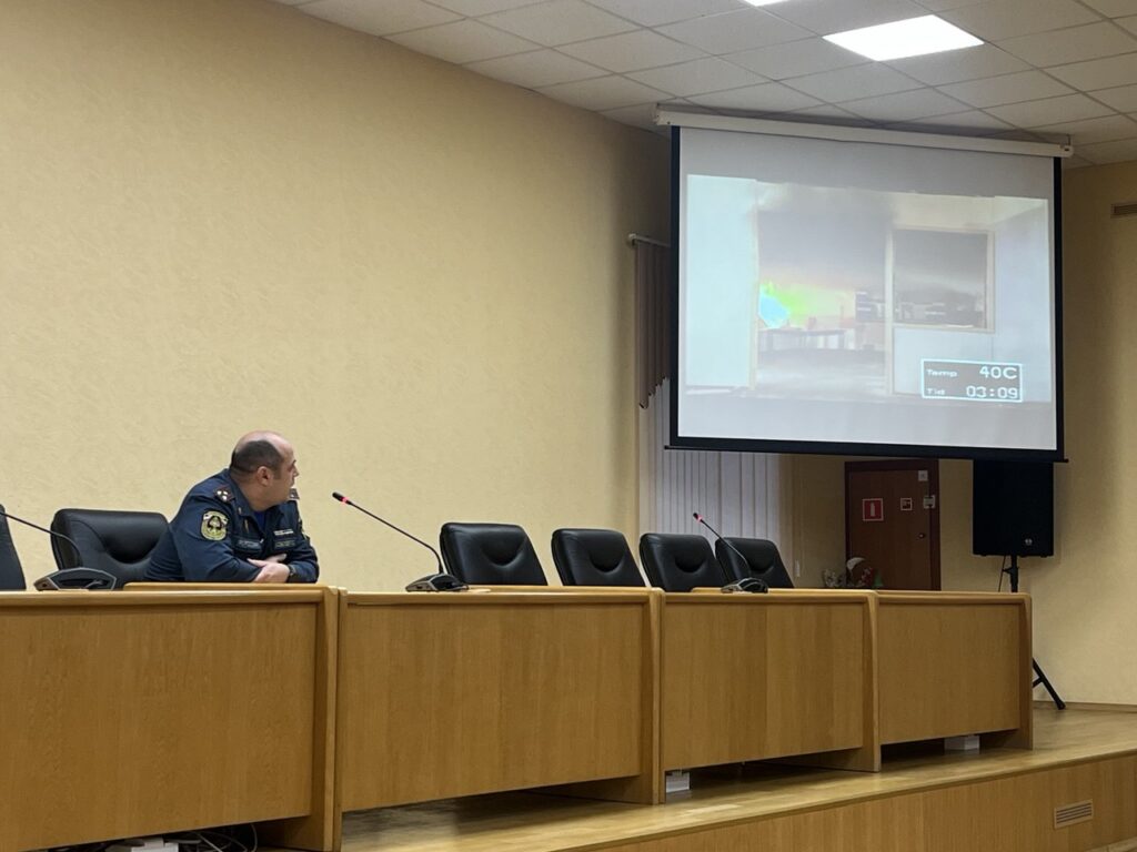 После этого началась демонстрация видеоматериала, в котором начальник управления МЧС России по Петродворцовому району — Павел Соболев — объяснил как происходит развитие пожара в помещении, на видео представлен смоделированный в жилой комнате пожар с начальной стадии развития (возникновение горения) до перехода к пожару, рост зоны горения, линейное распространение огня по горючим материалам, выделение дыма, температура до 200°C.